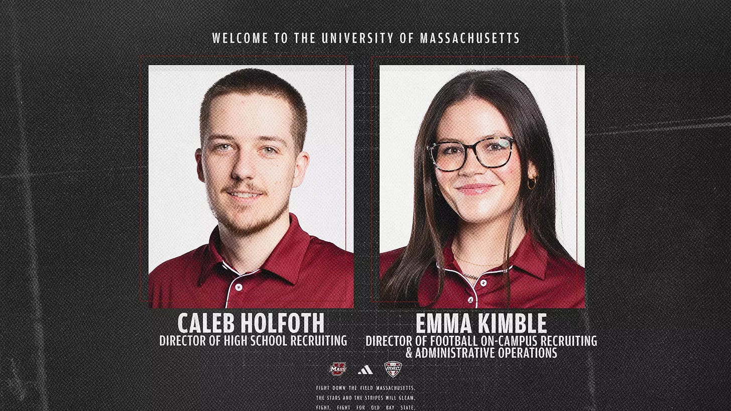 University of Massachusetts football has announced the additions of Emma Kimble as the Director of Football On-Campus Recruiting & Administrative Operations and Caleb Holfoth as the Director of High School Recruiting.